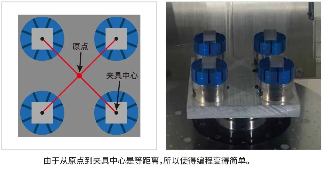 当时引进机械是被“5轴加工”这个词语误导了。我们曾认为在5轴加工机内以旋转轴的中心为基准,必须以减少错位和倾斜误差的方式设置工件才行。也就是一直认为5轴联动加工才是5轴加工机的唯一使用方法。此种惯性思维使得我们在同时加工多个工件时,即使加工中心有自动程序的修正,也导致每次都会发生中心偏差的原因。工件真的是需要用到5轴联动加工才能完成加工吗?考虑过各种方法后,注意到以单工序对工件进行5面加工的“多面加工”的方法适合本公司,将加工方法改成“5轴分度加工(3轴+2轴加工)”后,同时对多个工件进行加工就变得不是那么困难了。这次同时加工以工作台的原点,将形状固定夹具呈放射状,并以等距离置于原点周围,从而简化编程。实际加工时,先确定工作台的角度。这样就能使得和立式加工中心的程序一样,以平面为基准计算出工件的位置,进行“5轴分度加工”。将原点到夹具中心的距离划为等距离的方法,非常适合于以对心机构实现夹紧中心基准的形状固定夹具。同时,加工中心本身就搭载了自动程序的修正功能,所以整体并不是很困难。当然,最开始一次的设置时程序的修正并不成功很费劲,但只要明白修正的方法后,下次开始就能正常使用了。不限于形状固定夹具,5轴加工机的课题在于如何使其在晚间无人运行。